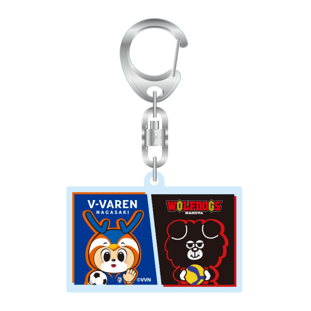 長崎開催がつないだご縁!長崎県をホームタウンとするサッカークラブ「V・ファーレン長崎」の人気マスコット「ヴィヴィくん」とのコラボキーホルダーが登場です。ウルフドッグス名古屋にとって、初となる“別競技”コラボグッズ。今回の長崎開催をきっかけに、マスコットがちょっと仲良くなれたかも?そんな特別なご縁から生まれた、両クラブのファンにぜひ手に取っていただきたいアイテムです。